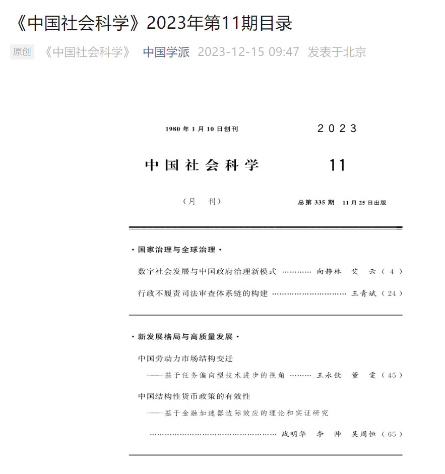 近日,我院战明华教授、李帅博士、吴周恒副教授的合作论文“中国结构性货币政策的有效性——基于金融加速器边际效应的理论和实证研究”在我校特级期刊《中国社会科学》2023年第11期正式发表。这是我校经管学部在《中国社会科学》上发表的第一篇论文。