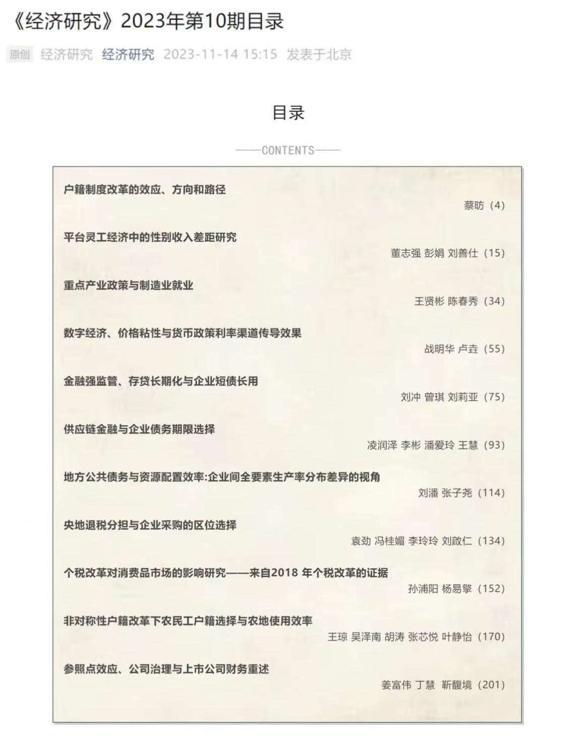 近日,我院以战明华教授为第一作者,博士生卢垚为通讯作者的合作论文“数字经济、价格粘性与货币政策利率渠道传导效果”在顶级期刊《经济研究》2023年第十期正式发表。