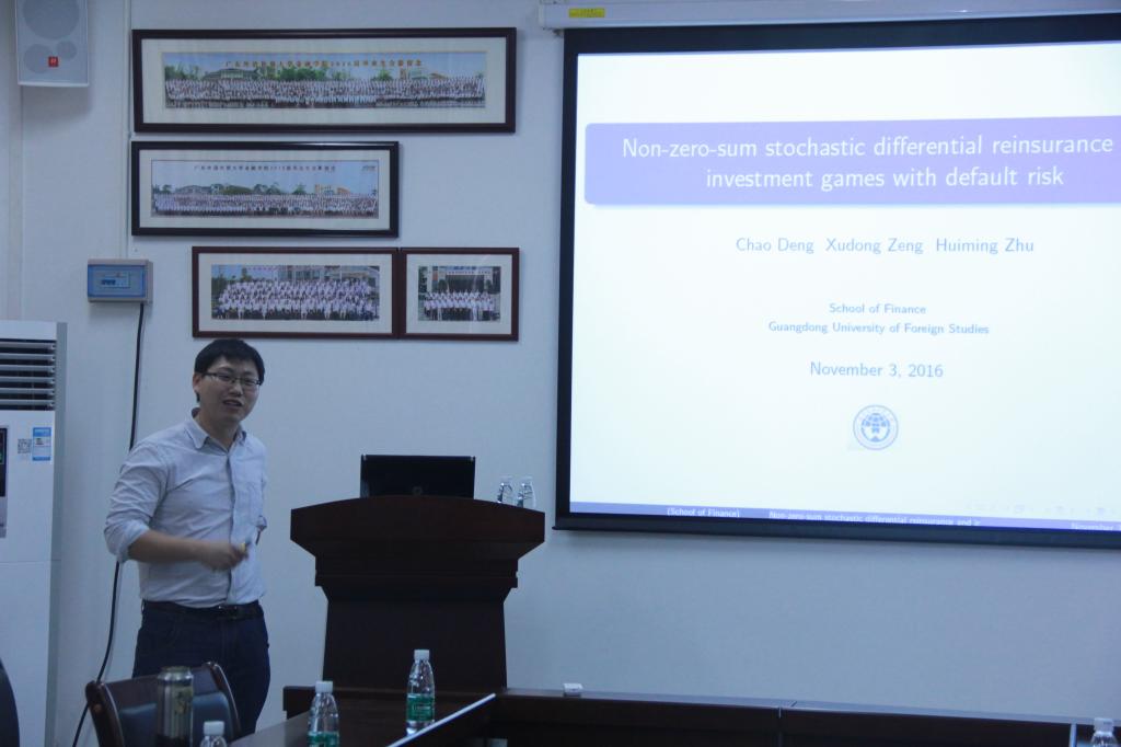 本网讯 11月3日下午,我院在南校区教学楼B304室召开金融学院云山学者双周论坛第二讲。云山青年学者邓超博士就《含违约风险的非零和随机微分再保险与投资博弈》做分析报告。我院副院长姚海祥教授及师生代表出席讲座。
