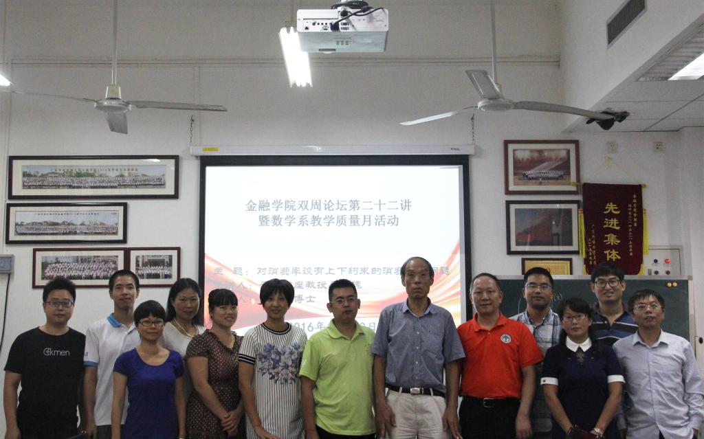 本网讯 10月20日下午,我院在南校区教学楼B304室召开金融双周论坛第二十二讲暨数学系教学质量月活动。云山讲座教授易法槐与我院师生分享关于“对消费率设有上下界的投资消费问题”的研究成果。我院党委书记马庆华教授、副院长姚海祥教授,数学系主任王军威及师生代表出席讲座。