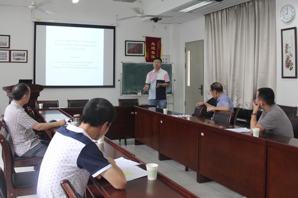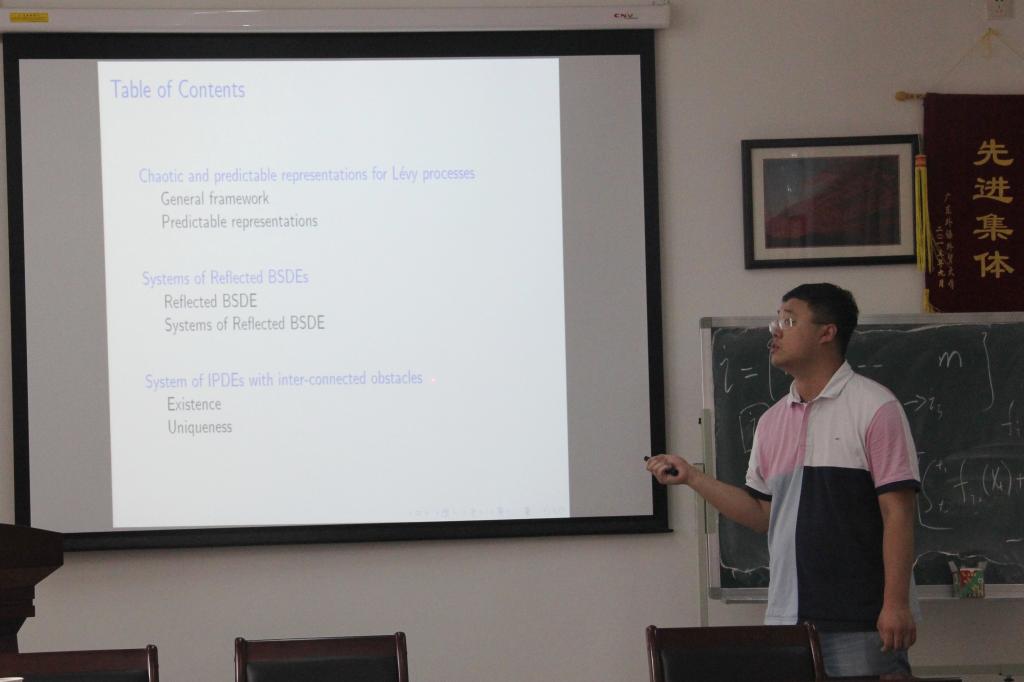 赵绪哲博士分享了“Systems of Integro-PDEs with Interconnected Obstacles and Multi-Modes Switching ProblemDriven Lévy process. ”的研究成果。该研究给出了带自扰放射源的m维变分偏微分方程组的粘性解存在唯一性。从概率论的角度来看,这个方程组与一类随机控制问题:由Levy 过程驱动的切换问题有着很深的联系,此切换问题的消费函数依赖于时间以及标的值,并证明了此切换问题的最优解是连续的并且是相应的HJB方程的唯一粘性解。他认为,该研究的主要结论推广到金融领域,不仅可以给出一类随机问题的最优解,而且还显性地给出了最优控制方案。