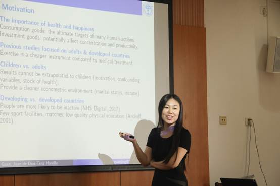 关晶分享了主题为“Estimating the Effect of Physical Exercise on Juveniles’ Health Status and Subjective Well-Being in China”的研究。她的研究评估了体育锻炼对中国初中生健康与幸福感的因果关系,使用来自中国教育小组调查(CEPS)的纵向数据库,该数据库通过考虑工具变量的使用和倾向评分匹配来处理体育锻炼的潜在内生性。研究结果表明,体育锻炼对健康有显著的积极影响,也略微提高了学生的幸福感。