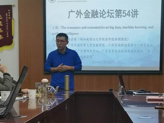 本网讯 2019年12月11日下午,香港中文大学经济学博士、美国芝加哥大学经济学博士后,现新加坡国立大学经济学院助理教授易君健应邀做客广外金融论坛第五十四讲,在我校南校区院系办公楼401室做了主题为“The economics and econometrics on big data, machine learning, and artificial intelligence”的专题讲座。此次讲座由广东外语外贸大学金融学院、广州华南财富管理中心研究基地、中国家庭金融与资产管理研究中心、广东省普通高校创新团队项目 “投资管理、期权定价和风险管理”联合举办,金融学院易行健院长主持,学院副院长张浩,教师代表姚海祥、杨碧云、张群、吴柏毅、邓超、周利、刘浩、朱佳青参加了此次讲座,我院众多博士、硕士研究生到场学习。