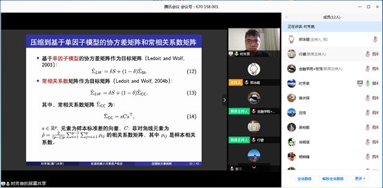4月9日上午,来自澳门大学的时芳泉博士、北京航空航天大学的曾庆铎博士、中山大学的杨锐锋博士分别分享了自己的研究成果。时芳泉博士带来了主题为“基于压缩逆协方差矩阵的改进型最小方差组合”的研究分享,他提到,常见的协方差估计量是样本协方差矩阵,但样本协方差矩阵的特征值通常比较分散,这导致样本协方差的逆矩阵中存在严重的估计误差。为了处理这个问题,他的研究提出了一个基于压缩Schatten p 范数(𝑝 ≥ 1) 来估计逆协方差矩阵一般框架。该方法具有计算快速和高效的优点,另外,也没有假设逆协方差矩阵具有稀疏性结构,更适合描述现实世界中资产收益率的特征。杨锐锋博士的分享主题为“重男轻女、助儿成家与老年家庭消费房产财富效应”。他运用中国家庭调查数据,从子女存在及数量、子女性别、子女婚姻状况、不同类型购房预期等角度,深入考察遗产动机、“重男轻女”和“助儿成家”如典型的购买婚房对老年家庭消费房产财富效应的影响。曾庆铎带来了主题为“公共情绪与价格传染”的研究分享,他通过构建多资产理性预期模型来描述价格传染效应,研究发现,市场上存在两种效应:(1)联动效应:两类资产的知情交易者在信息获取上存在正的相关性;(2)挤出效应:公共情绪的相关性越高,知情交易者信息获取的激励越小。