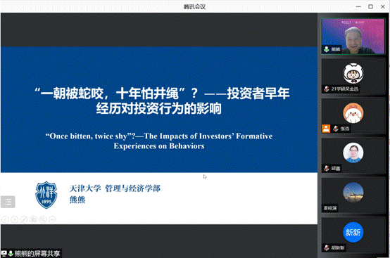 11月15日,天津大学管理与经济学部熊熊教授应邀做客广外金融论坛81讲,通过线上会议的形式,为师生带来题为“一朝被蛇咬,十年怕井绳”——投资者早年经历对行为的影响”的学术讲座。讲座由金融学院副院长张浩主持,卢万青教授、张群副教授、云山青年学者刘浩博士、等多名教师和各年级学生参加。