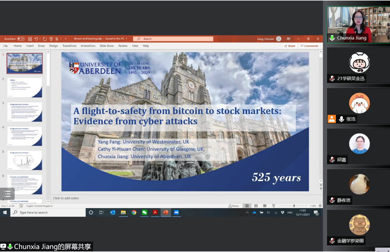 11月12日,英国阿伯丁大学商学院姜春霞副教授应邀做客广外金融论坛80讲,通过腾讯会议的线上形式,为师生带来题为“A flight-to-safety from bitcoin to stock markets: Evidence from cyber attacks”的学术讲座。讲座由金融学院副院长张浩主持, 我院多名教师及学生参加。