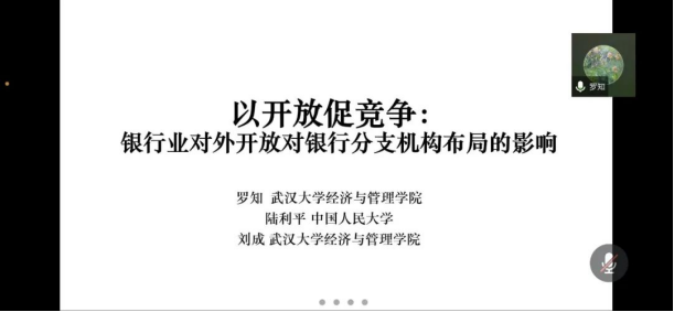 6月13日,武汉大学经济与管理学院副院长罗知教授应邀做客广外金融论坛第92讲,通过线上会议的形式,围绕“以开放促竞争:银行业对外开放对银行分支机构布局的影响”主题为我院师生带来了一场精彩的讲座。此次讲座由金融学院副院长张浩主持,学院教师、各年级学生积极参与。