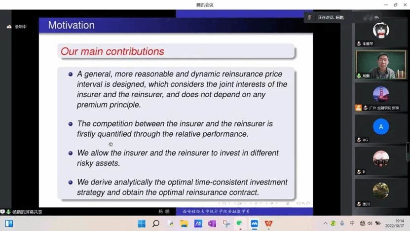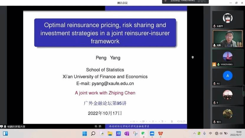 10月17日,西安财经大学杨鹏副教授应邀做客广外金融论坛第95讲,通过腾讯会议,以“Optimal reinsurance pricing, risk sharing and investment strategies in a joint reinsurer-insurer framework”为题为我院师生带来了一场内容充实的精算学领域前沿研究讲座。此次讲座由金融学院风险管理与保险学系副教授张琰主持,学院师生积极参与,受益良多。