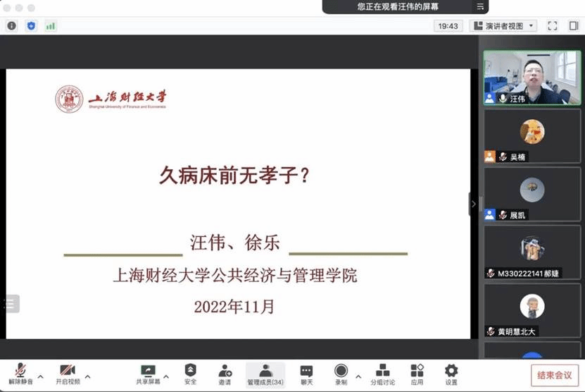 11月18日,上海财经大学讲席教授汪伟应邀做客广外金融论坛第101讲,通过线上会议的形式,以“久病床前无孝子?”为题为我院师生带来了一场精彩的讲座。此次讲座由金融学院院长展凯主持,学院教师、各年级学生积极参与。