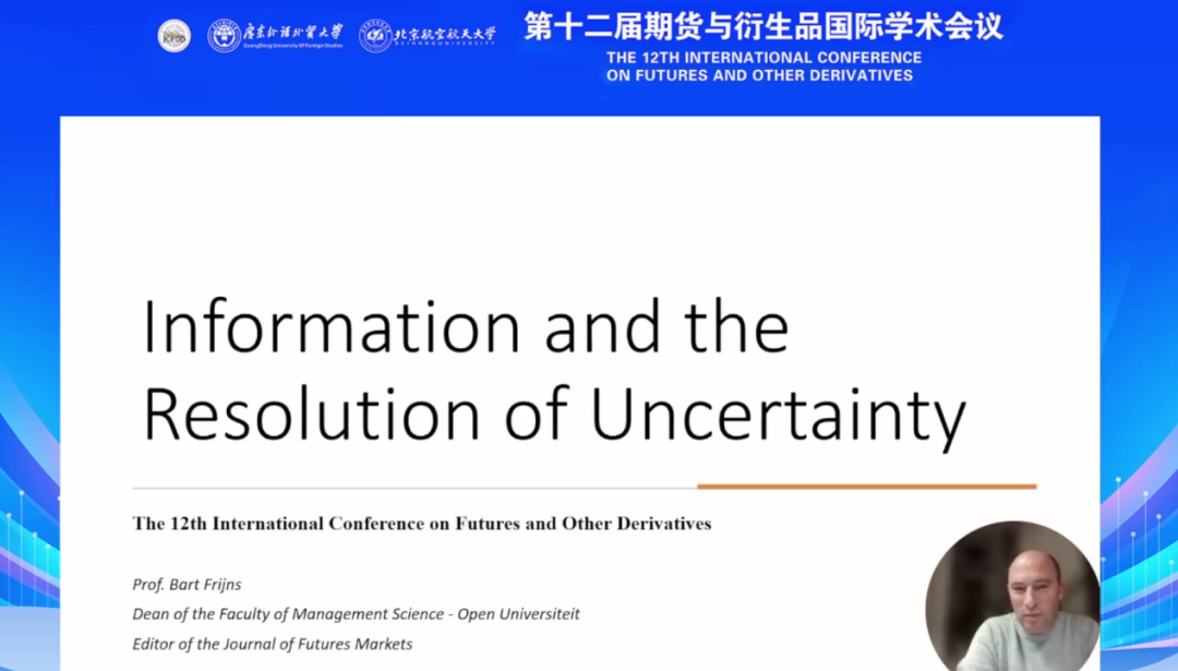 Bart FRIJNS通过视频形式作题为《信息与不确定性的解决》的主旨演讲,他通过阐述信息与不确定性对期权的影响,结合新闻、农产品市场、跨市场的信息冲击以及宏观经济新闻公告中的价格发现等的具体事例,说明当前在不确定性的研究领域仍有较大空间,并存在一定挑战。