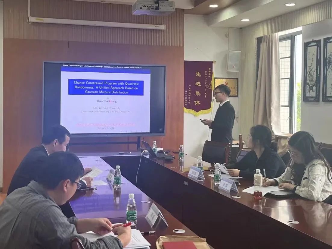 庞小川分享的主题为“Chance Constrained Program with Quadratic Randomness: A Unified Approach Based on Gaussian Mixture Distribution”,即研究二次随机变量的机会约束规则,其中二次随机变量定义为一个服从多元高斯混合分布(GMD)的随机向量的二次型。他认为,模型求解难度在于二次随机变量的分布不具有解析表达,因此只能使用合理的分布进行近似。