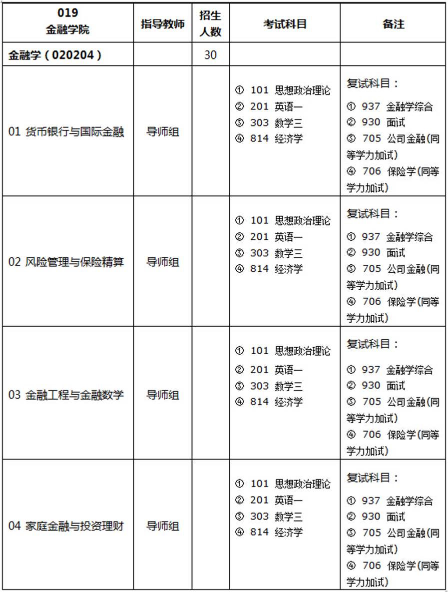 2003年在国际贸易学硕士点下开始招收“国际金融方向”的硕士研究生, 2012年开始招收金融学专业硕士研究生。金融学学位点现有硕士生导师19位,其中教授16位,副教授3位,拥有博士学位导师15位。金融学硕士点目前开设了货币银行与国际金融、金融工程与金融数学、风险管理与保险精算、家庭金融与投资理财等4个研究方向,专业培养方案实行理论性与应用性的深度融合,致力于培养兼具经济学、金融学、数学和计算机知识的复合型人才,学生毕业后可从事银行、证券、保险、投资、金融监管、国际商务等领域的工作。金融专业的研究生就业情况良好,不仅就业率达到了100%,而且就业层次也非常高, 70%以上的毕业研究生进入了商业银行、保险公司、跨国公司、人民银行等金融机构或金融监管部门,毕业生质量受到社会的广泛好评。