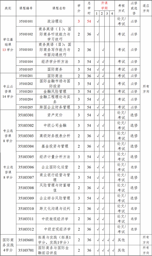 国际商务硕士专业学位要求学生修满 39 学分。其中:学位课修满 13 学分,专业必修课