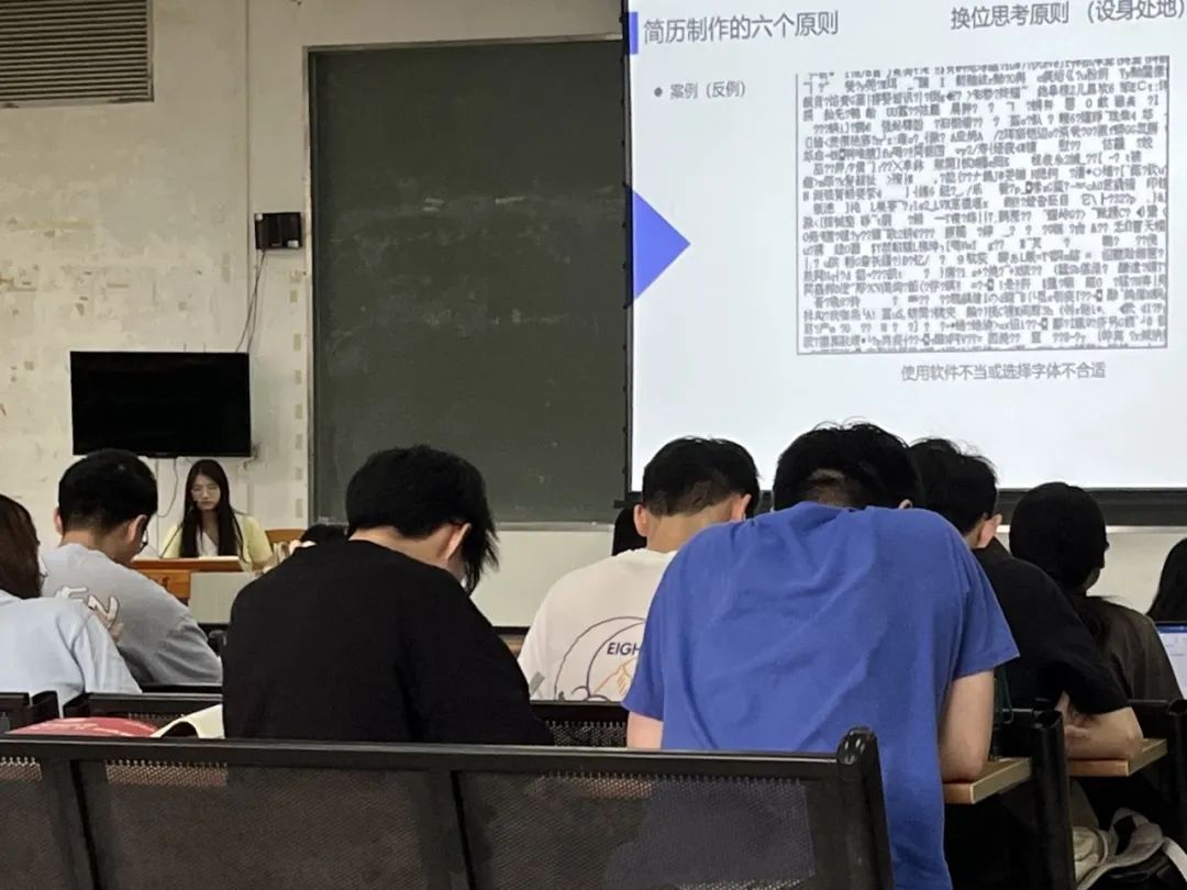 随后,饶卉、黎思蕾进行了简历制作课程。饶卉向学生阐述了制作简历的六个原则,包括匹配性原则、有效信息原则、极简原则、量化原则、对称性原则与换位思考原则。她表示,实行六个原则能有效展示简历亮点,帮助学生突出自我优势,提升学生简历竞争力。黎思蕾介绍了制作简历的相关技巧。她从通用模板与个人经验两个角度出发,向学生示范了如何制作一份优秀简历。