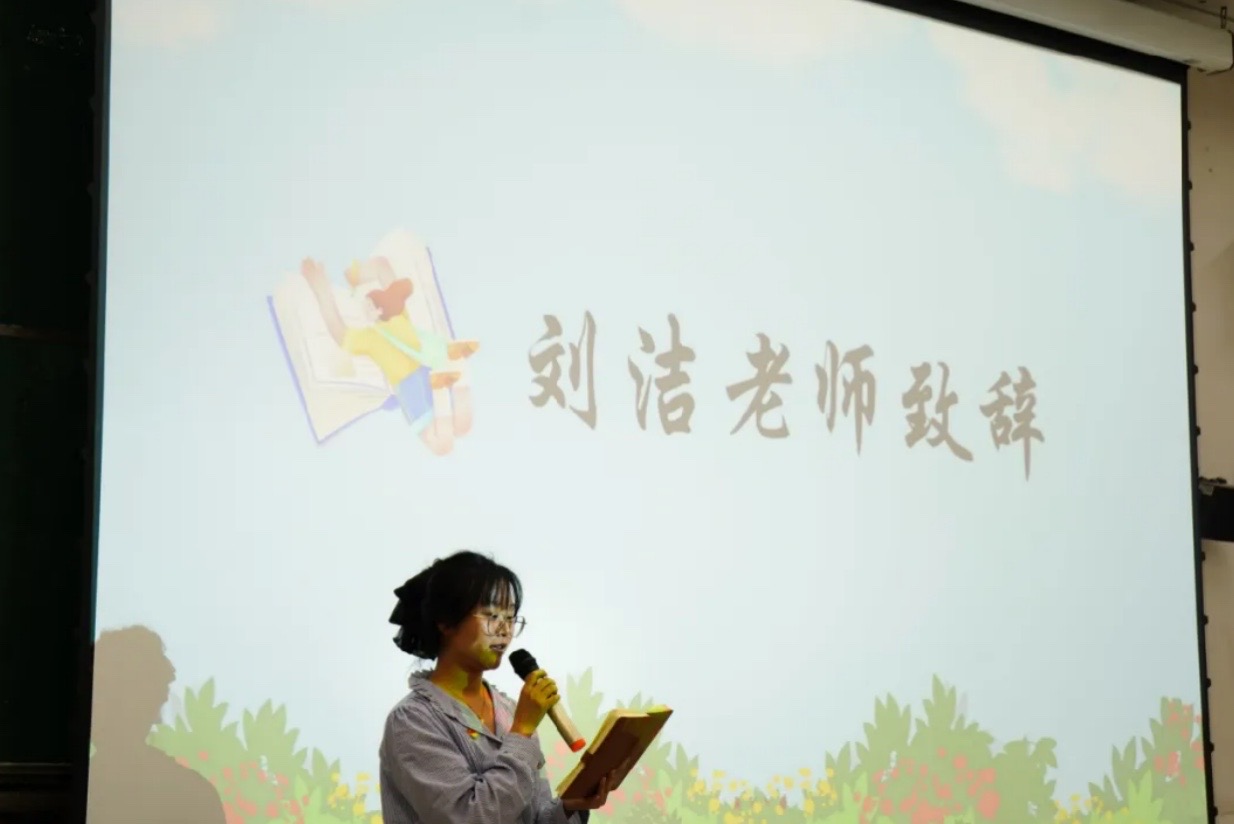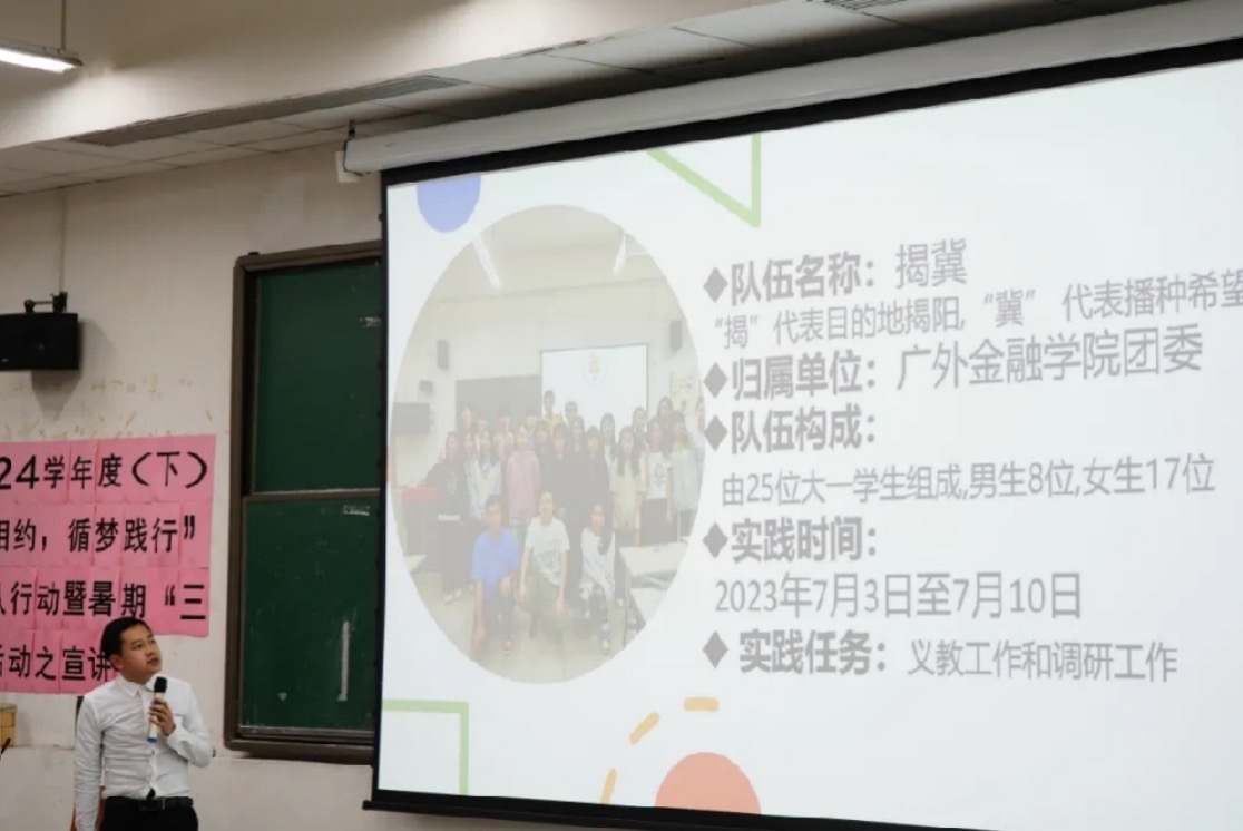 在致辞与颁奖环节之后,金融学院22级学生黄广钜上台为同学们进行经验分享,通过系统地介绍去年揭冀队前往揭阳乡村开展义教、调研等活动的流程,展示团队充满趣味性的授课实践、同学与乡镇居民之间的亲切交流及在社会实践活动取得的丰厚成果,为即将参与社会实践的同学们提供了宝贵的经验。