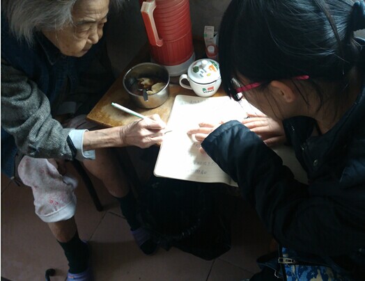 一位听力不好的婆婆,只能用纸笔与志愿者们交流,缓慢的谈话进度丝毫不影响聊天的气氛。和老奶奶的谈话中,志愿者了解到很多关于她的信息,比如她会说日语,写着一手好字等等。当婆婆一笔一划写出“很幸福”时,在场的志愿者都被她的乐观心态感染了。