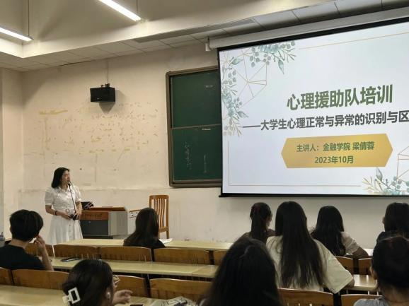 会议伊始,梁倩蓉回顾了心理援助队目前取得的佳绩以及今年5.25心理活动月中心理援助队举办的系列精彩活动。她勉励各心理委员继续保持为学院心理健康建设服务的热情和认真的工作态度,积极参与心理援助队的工作。接下来,她详细解读了学校和学院心理委员管理规定,要求各班心理委员认真履行工作职责,从认知、情感、意志行为等方面关注同学们的心理状况,积极向心理援助队投递心理常识科普小推文,定期参加培训活动,同时特别提醒了各心理委员应遵循保密原则。随后,梁倩蓉作“大学生心理正常与异常判断”的专题培训。她指出,班级心理委员肩负着观察同学心理状况、关心帮扶困难同学的任务,要善于把方法运用在生活中,关心班级同学心理状况,适时给予支持和帮助。最后,梁倩蓉老师介绍了金融学院心理小家的布置情况,向金融学院全体同学征集心理小家的名字。在生动的讲解和有趣的互动环节中,心理委员纷纷表示本次培训会让他们收获颇丰,受益匪浅。本次心理援助队培训会提高了各班心理委员的心理健康专业素养,为后续各班心理工作展开提供了清晰的思路,也为学院心理健康工作的进一步开展奠定了基础。未来,金融学院将继续关注和重视学生的心理健康教育,为同学们的身心发展保驾护航!