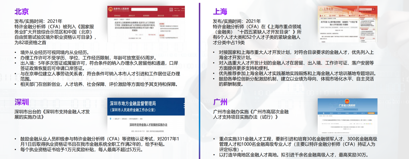 北京、上海、 广州、深圳、西安、苏州、宁波、武汉、成都、杭州、南京、天津、厦门等20余省市地方政府均发布了对CFA持证人的人才吸引或支持政策。其中广州市金融办实施的《广州市高层次金融人才支持项目实施办法》针对金融高级人才最高可奖励30万元。