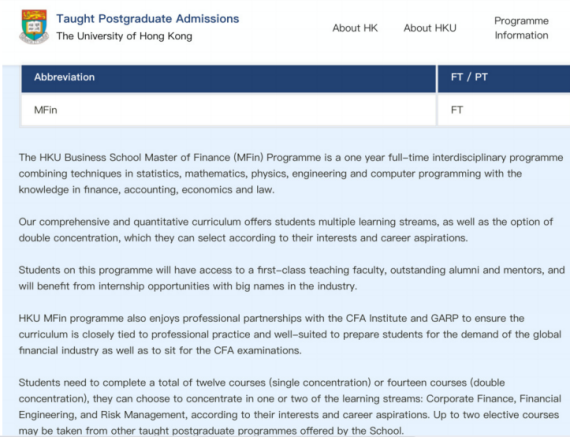 在毕业学子中备受喜爱的香港留学,以香港大学商学院金融硕士(MFin)课程为例,必须完成总共12门课程(包括4门以CFA课程为基础的财务分析基础课程),还与国际CFA金融协会和GARP(Global Association of Risk Professionals-FRM证书官方协会)建立了专业合作伙伴关系。