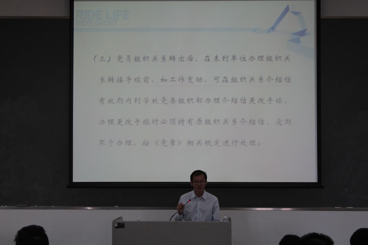 紧接着,叶祥杰老师就毕业班党员组织关系转移作了相应培训。叶老师从党组织关系转移的注意事项、原则、工作安排等多个方面进行详细讲解。培训过程中,为让毕业生党员们更好的理解培训内容,他多次通过举例来说明。在之后的答疑环节,叶老师也为大家作了针对性的解答。本次培训旨在为党员提供更详尽的组织关系转移知识,给予毕业生党员更多便利。