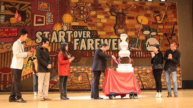 在观众对《大保一变变变》依旧充满好奇之时,主持人缓步上前,神秘节目也就此揭开面纱——金融学院党委书记马庆华教授献唱一曲《呼伦贝尔大草原》。全场掌声连连,金融学子在台下激动的心情也是溢于言表。更大的惊喜还在后面,工作人员推上的四层蛋糕吸引了全场的目光。在金融学院即将迎来第一个新年之际,主办方特意设计了“切蛋糕”这一环节,让我们共同祝福金融学院走向更好的明天。金融学院的辅导员老师们也登台表达了对年轻的金融学院、富有朝气的金融学子的新年祝福。