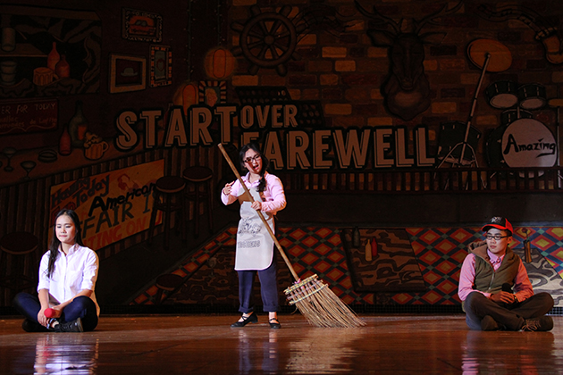 全金融1301首先奉上了一出让不少人感同身受的《没时间》。名叫“梅世坚”的主人公总是沉迷于游戏、忙于社团,就是没有时间用于学习和生活。他在梦境中变为学霸,可终究要意识到自己是学渣的现实。寓意深刻的表演中还穿插着各种元素:“斯国一”、“么么哒”等流行语、梦境中一袭黑衣的“使徒行者”、极具地方特色的东北秧歌儿……这些为话剧增添不少“笑料”,当然也博得了观众的一片喝彩。而金融1202的《情非三年》则为我们讲述了在不到三年的大学时光中他们在班级中的点点滴滴。从在车站同班同学的初识,到秋之声“伟大”同学的夺冠;从女生节时男生到宿舍楼下轻拨吉他倾情演唱《情非得已》,到女生以轻快舞蹈回应的一句“不约,叔叔,我们不约”;从英戏的意外落败,到广交会上重拾活力的激情串烧……“大一到大三的回忆很有意义啊”——微信墙上也随之涌出许多大三大四“老饼”的感叹。最后一幕,他们大喊“5、4、3、2、1,金融1202,耶!”,相机定格于这一瞬,舞台上同学的眼眶也已泛红。想必这次经历又给他们带来了一份沉甸甸的记忆与别样的感动。