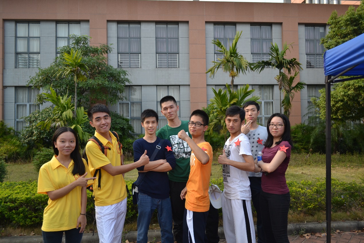 12级金融第二学生党支部抵达终点后合照留念,参赛代表露出淡淡的笑容,尽显他们的默契。队员们左肩的红星十分耀眼,象征他们充满正能量。