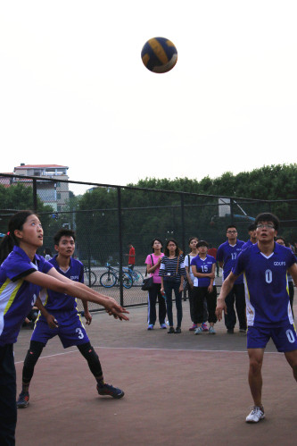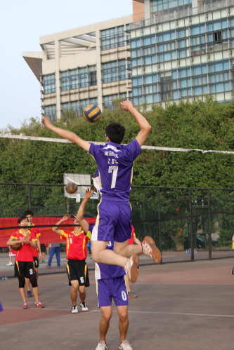 首局开场,我院孙韶生一个强有力的扣球,致对方扑空,夺下该局首分,顿时引起全场欢呼。其后双方迅速进入状态,使得局势异常紧张,全局过程中双方分数先后14次追平。接近局末时,形式更加严峻,当金融与经贸比分为20:22时,双方啦啦队不断呐喊助威,金融健儿一鼓作气,连夺5分,终以25:22获胜。