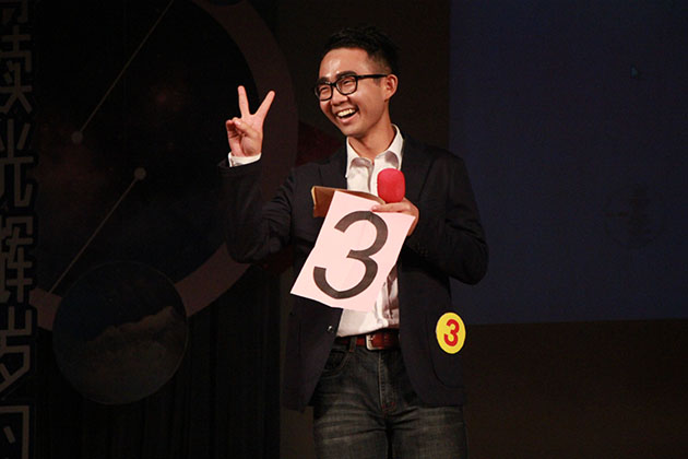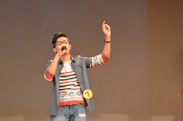 第一环节自选自唱——“青春回声”一开场,来自金工1401的韦尹济用一首《我》便把现场观众唤回了“哥哥”张国荣的时代。“I am what I am.”作为新生,略显紧张羞涩的他深情款款地唱道。随后,金融1304的黄望圭身着酒红色短裙,淡定出场。辨识度极高的声音和细腻的情绪处理让她的《叶子》如故事般娓娓道来。当晚现场的第一个小高潮出现在“蛮拼的班导”演唱《金融三班的日子》时,金融三班到场的同学大声喊道“阳麟美唱响广外,金融三与你同在”,为他们的班导加油助威。三位班导登台后会心一笑,仿佛也被勾起了许多回忆。他们自己改编歌词的曲目带给在场观众别样的感动,甚至已有同学擦拭眼角。离台前他们高喊“我们都会在这里”,为比赛营造出温馨的氛围,更是赢得满座掌声。而后登场的是本晚的第二个组合Cross乐队,键盘,箱鼓,主唱,在设备不是很完善的情况下依旧精彩的演绎了《Nothing on you》。