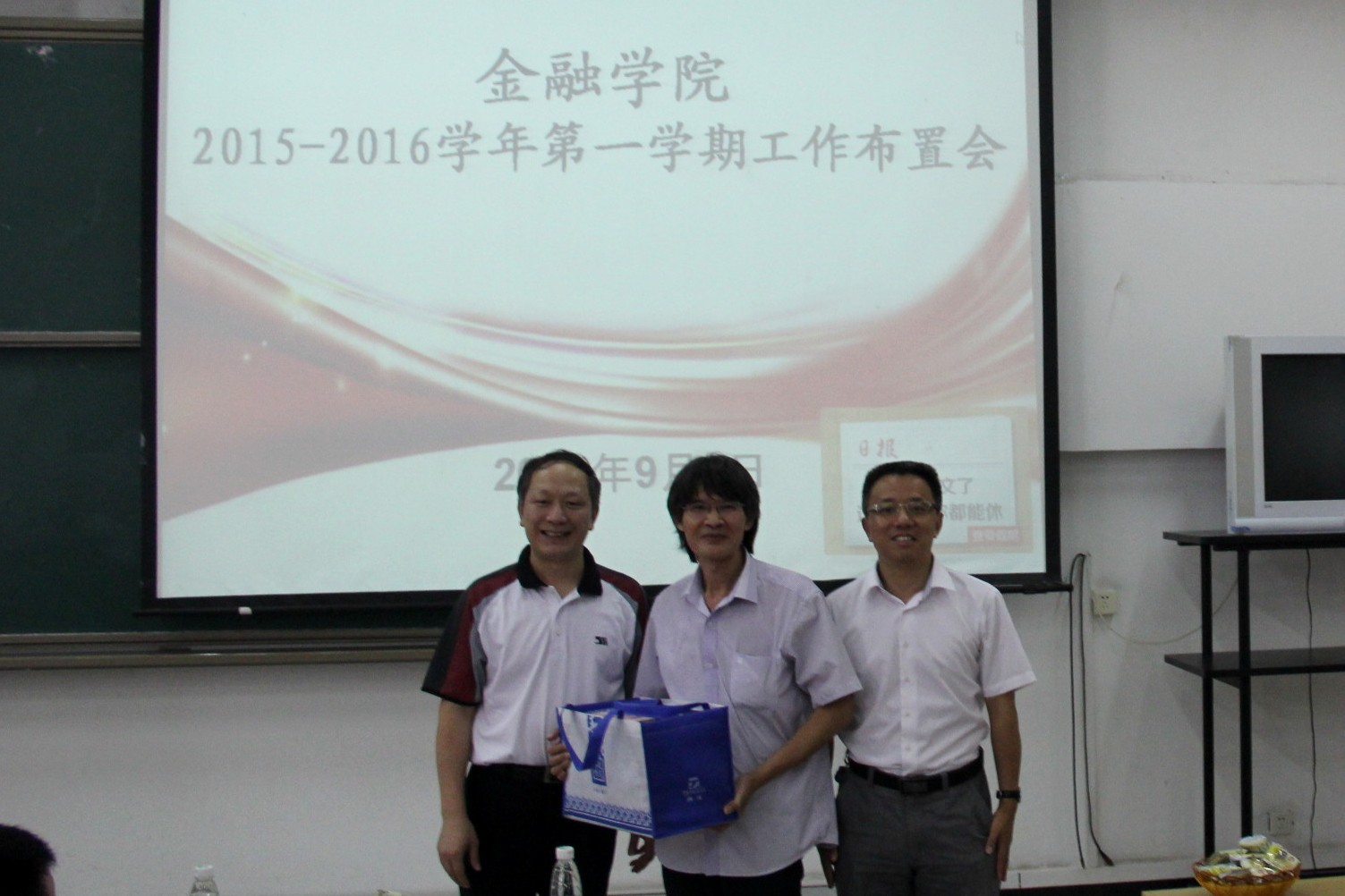 本网讯 9月6日下午,金融学院2015-2016学年度第一学期工作布置会在南校区教学楼C308召开,金融学院院长易行健教授、金融学院党委书记马庆华教授、副院长展凯教授、副院长姚海祥教授、副书记赵观音和全院教职工参加了会议。会议由马庆华教授主持。