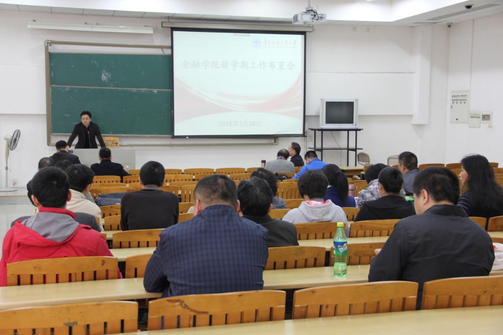 本网讯 2月28日下午,我院2015-2016学年度第二学期工作布置会在南校区教学楼C308召开,金融学院院长易行健教授、金融学院党委书记马庆华教授、副院长展凯、副院长姚海祥、副书记赵观音、院长助理王迪和全院教职工参加了会议。会议由展凯主持。