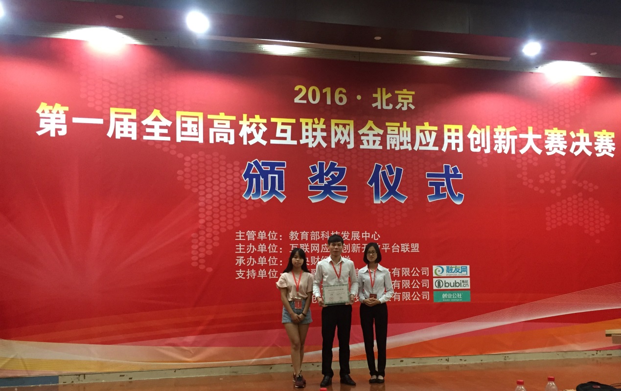 本网讯 5月21日至22日,第一届全国高校互联网金融应用创新大赛决赛在中央财经大学举行,我校学子的设计作品《“微校保”APP》荣获全国三等奖的佳绩。该团队由我校金融学院学子吴嘉文、陈楚瑶和思科信息学院学子徐志婷组成。
