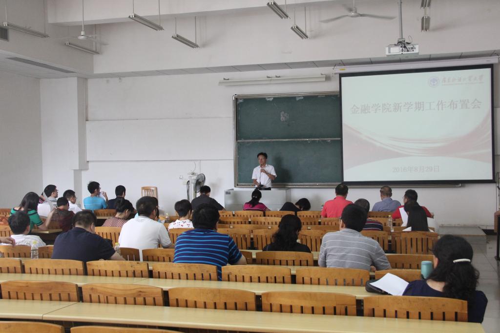 各分管院领导就新学期的工作计划和要点进行了说明和布置。展凯分别介绍新入职的教师,并着重对研究生招生、研究生学术论坛筹备、应用金融研究中心终期考核、绩效工资方案修订、办公室装修等事宜进行说明;姚海祥主要介绍我院的科研成果,通报我院上学期期末监考情况,并对本科教学评估工作进行部署;赵观音围绕迎新工作、毕业生就业、创新创业中心的筹建与学生专业赛事等方面,部署新学期的学生工作。