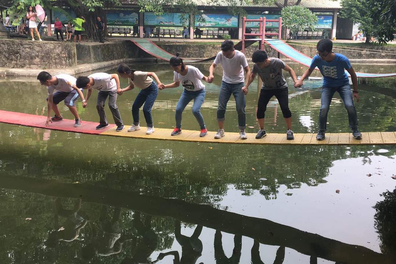 活动当天,全体人员于早晨八点集合完毕,准时出发。在导游的介绍和带领下,经过一小时车程,MIB师生来到活动的目的地——笑翻天乐园。老师与同学们一起被分成两组,在各组推选出的组长带领下,各个小组各自选定了响亮的组名,唱起嘹亮的队歌,并进行了精彩的团队展示,团队智慧比拼。随后在教练的带领下,MIB师生们一起开始了拓展之旅。