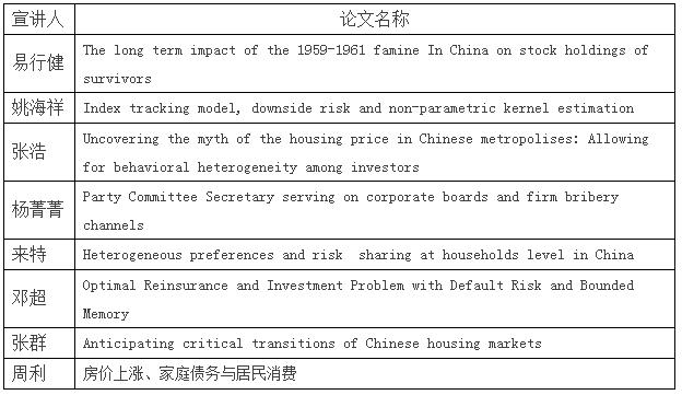 下午,年会进入分会场报告阶段。此次我院共有八名教师的论文入围年会的分会场报告,包括院长易行健教授、副院长姚海祥教授、院长助理张浩博士、杨菁菁副教授、来特副教授、邓超博士、张群博士和周利博士,易行健教授还担任了分会场的主持。他们宣读的论文涵盖了我国家庭金融、金融工程、公司金融和房地产金融等多个金融学科的主流研究方向,并获得了参会学者丰富和富有建设性的论文改进意见。此外,多位参会教师还承担了年会入选论文的点评,并与来自国内外知名高校的金融学者关于金融学科的最新发展进行了深入交流。