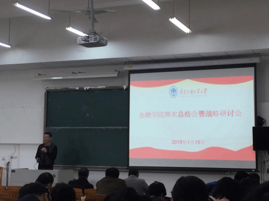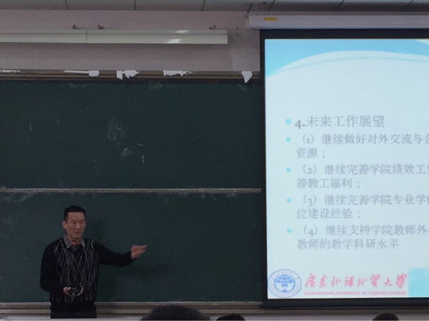 展凯介绍了我院本学期行政、人事、财务、对外交流和合作、研究生和学科建设等工作。他谈到,本学期我院接待校外来访专家和兄弟院校来访多次;顺利完成了人才引进工作;顺利举办第四届金融管理年会;学院办公室场地调整规划也制定完毕,出台了《金融学院退休教职员工待遇计发的管理规定》,体现人文关怀;2017年学术型研究生招生形势喜人;广州华南财富管理中心研究基地获得广州市重点人文基地立项;学院各项财务状况不断改善,教职工福利稳步提高等等。接下来,展凯对未来工作进行了展望,未来将从四个方面继续深入:继续做好对外交流与合作,开拓教育培训和承接课题资源;继续完善学院绩效工资管理制度,努力开源节流,改善教工福利;继续完善学院专业学位点建设工作,外出调研专业学位建设经验;继续支持学院教师外出进修和学习,全面提高我院教师的教学科研水平。