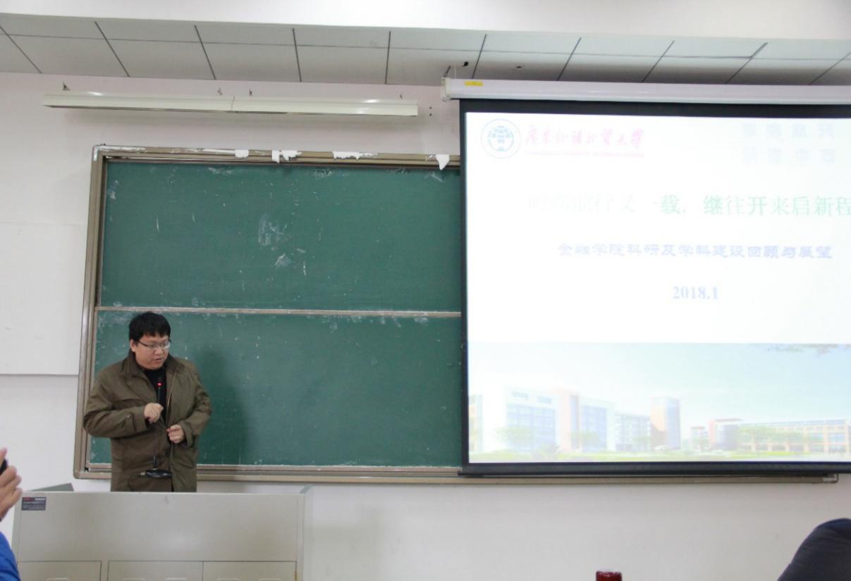 易行健从2017年工作总结、存在的问题、2018年工作重点等方面对我院工作情况进行全面梳理和总结,并对2018年度学院发展作出展望。易行健首先对我院过去一年的各项成绩提出表扬,向各位辛勤工作的教职工表示感谢。回顾了2017年我院取得的各项成绩:我院顺利完成应用经济学一级学科博士点和金融专硕学位点的申报,顺利完成教育部本科教学审核评估,数学学科成功立项第一个校级创新团队项目并申报省级创新团队,金融工程硕士点2018年开始招生,新分设成立投资理财系并成立研究生工作办公室,师资和人才队伍、高层次人才项目申报取得重大进展,与北京师范大学和青岛大学一道成功入选中国金融学年会理事单位 ,举办第四届中国金融管理年会