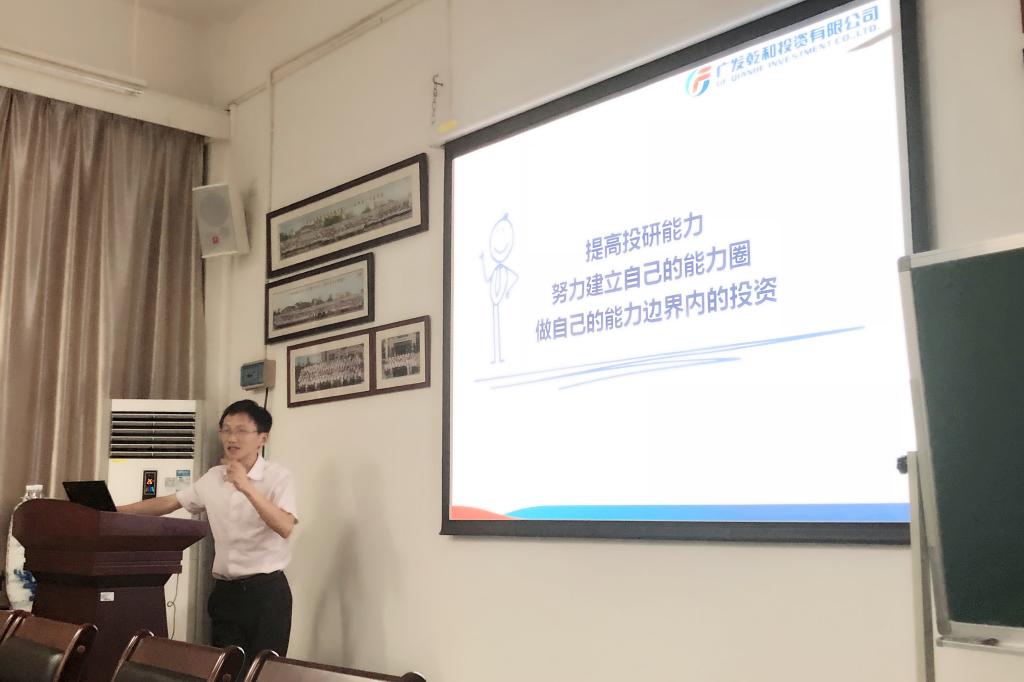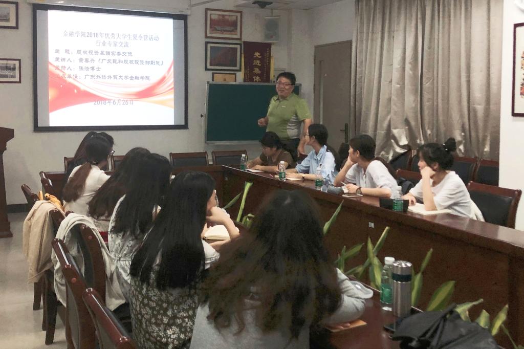 本网讯 6月26日晚,广发乾和投资有限公司股权投资一部副总经理黄春兴做客金融学院2018年优秀大学生夏令营,在南校区教学楼B栋304会议室向夏令营营员展开了精彩的“股权投资业务尽调实务交流”的主题演讲。讲座由金融学院副院长张浩博士主持。