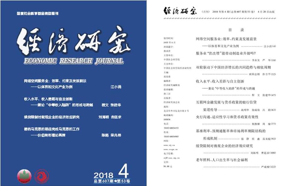 我校金融学院云山杰出学者战明华教授于以第一作者在经济类权威期刊《经济研究》2018年第四期上发表题目为《互联网金融发展与货币政策的银行信贷渠道传导》的学术论文。《经济研究》为我国经济学领域权威的学术期刊,其影响力指数(CI)为1414.2,学科排名居于首位;同时,《经济研究》的复合影响因子、期刊综合影响因子、人文社科影响因子分别为10.597、7.896、7.690,学科排名全部居于首位。此类高水平学术论文的发表,为促进我校学科建设的发展和提升我校学术影响力方面起到积极作用。