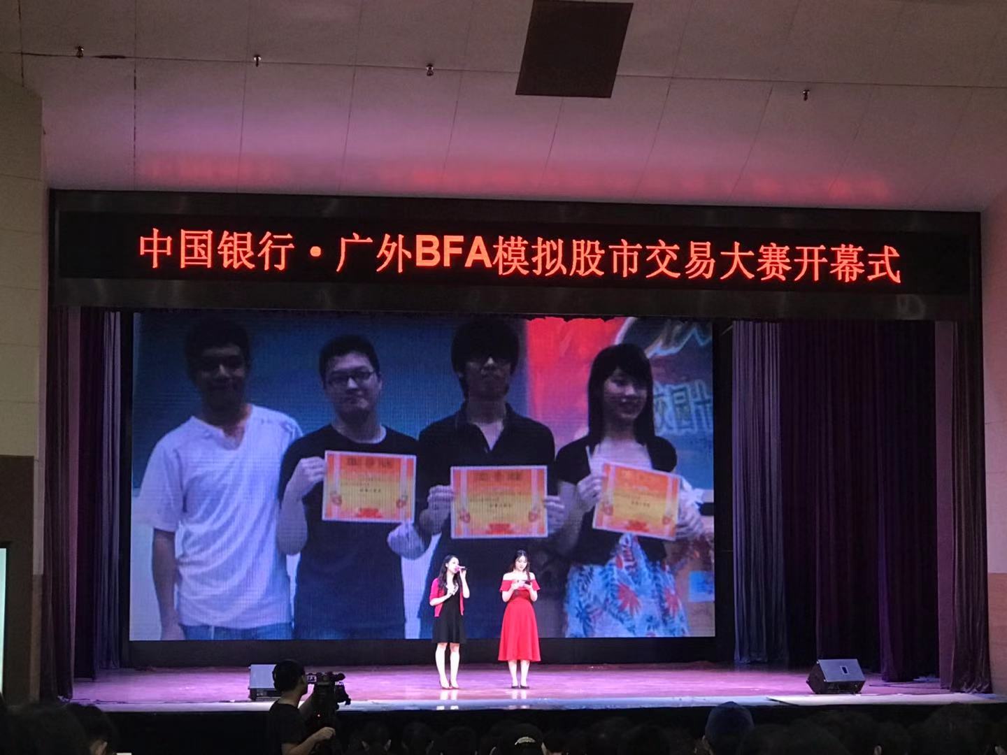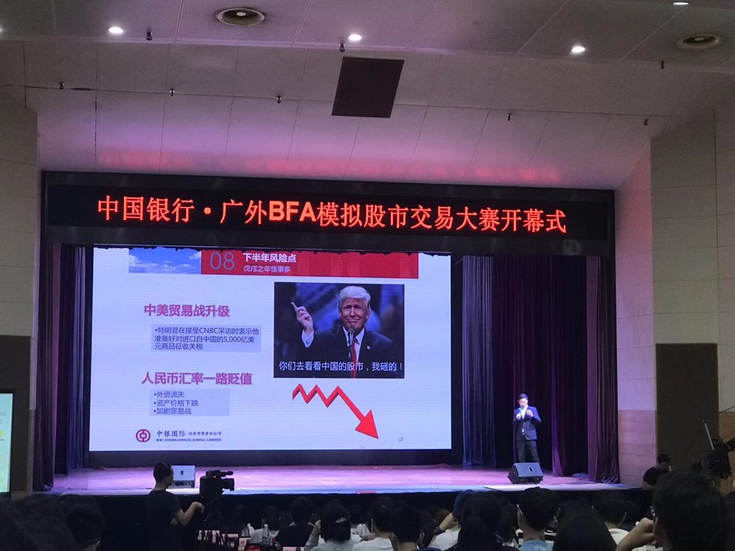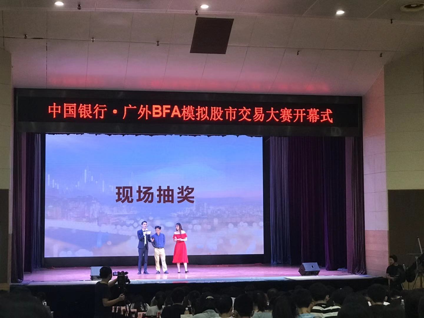 本网讯 10月28日晚,稳操胜券,为自己正名——广东外语外贸大学模拟股市大赛开幕式在我校南校区B8学术报告厅举行。比赛由我院校级优秀实习基地中国银行广东省分行、广外商业金融协会共同举办,我院院长及党委书记易行健、副院长张浩、党委副书记赵观音,中国银行广东省分行网络金融部副总经理刘双兵、省行个人金融部高级经理杨建铭、白云支行副行长訾先萍、中银国际证券广东分公司市场总监张伟志出席了本次开幕式。