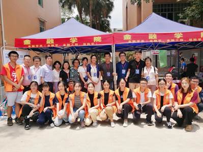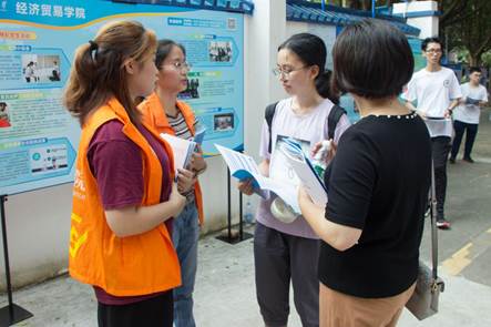早晨9点后,考生和家长们陆续到达咨询现场,金融学院领导和老师们与有意向报读金融相关专业的考生和家长面对面交流,十分耐心地为考生、家长现场答疑解惑、详细介绍今年的招生政策、师资力量、院系特色、人才培养模式、专业设置、行业发展等情况。现场的考生不仅能够得到各院系老师的指导,也可以与在校的学长、学姐有更进一步的交流,为他们在报考学校和专业上提供重要参考。另外,热情活跃的志愿者们手持学院宣传册分别在校门口、摊位前向家长和考生推介金融学院。