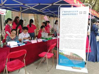 广外校道翠色盈盈,风景如画。金融学院党委书记徐昶斌、副院长杨菁菁、副书记赵观音、院办主任陈健、投资理财系主任崔萍、保险学系主任余艳莉、金融工程系主任张林、金融系副主任吴薇、学工办和教务办老师以及学生志愿者早早来到摊位,做好招生咨询的所有准备,静候家长和考生的到来。