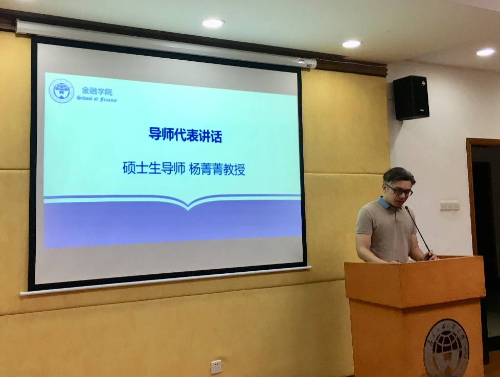 随后,导师代表杨菁菁教授上台发言,对金融学院、金融行业的发展进行介绍,并对研究生生活提出几点建议:打磨自身竞争力、拓展知识领域和职业技能;加强自身道德素养;提高独立的动手和思考能力;与导师保持良好的沟通。
