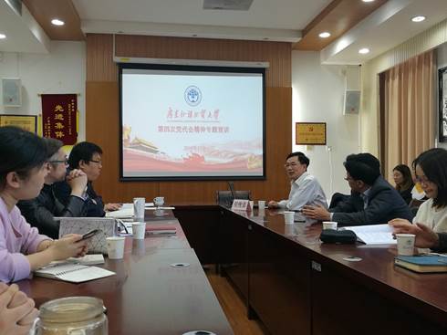 本网讯 为深入学习贯彻第四次党代会精神和提高学院中层干部思想觉悟、业务水平,我院于11月29日下午召开“学校第四次党代会精神宣讲暨干部培训会议”,校第四次党代会精神宣讲团成员、校党委常委、副校长何传添教授为师生宣讲解读学校第四次党代会精神,财务处结算中心科长刘帼眉、经贸学院国贸系教工党支部书记田云华博士以及我院分管教学副院长杨菁菁教授进行相关业务培训。学院领导班子成员,各党支部书记、支委,各系主任、副主任、学生党建骨干参加了此次活动。活动由学院党委书记徐昶斌主持。