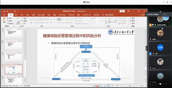 7月22日上午,我院保险系教师孙晓珂博士开展了主题为“健康保险经营与管理”的线上讲座。讲座由保险系主任任辉主持,保险系老师余艳莉、朱华琳、刘倩和我院学生出席。孙晓珂博士分别从健康保险的内涵和健康保险在经营管理过程中的风险分析两个方面进行了阐述,为同学们建立了关于健康保险经营与管理的理论框架。