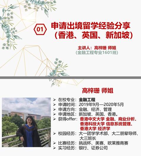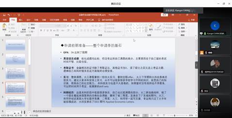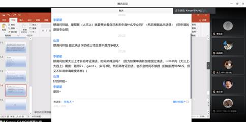 7月22日晚上,我院15级毕业生党康妮(目前新加坡国立大学统计学硕士)在腾讯会议平台为金融系师生带来一场题为《金融专业出国升学经验分享》精彩讲座。