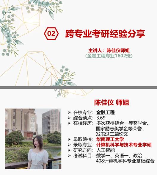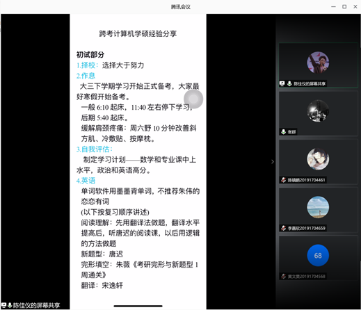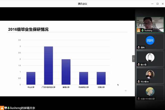 7月21日下午,我院金融工程专业的陈佳仪同学在线上分享了自己跨专业考研的经验。会议由金融工程系主任张群主持,由辅导员梁倩蓉组织并出席参加。