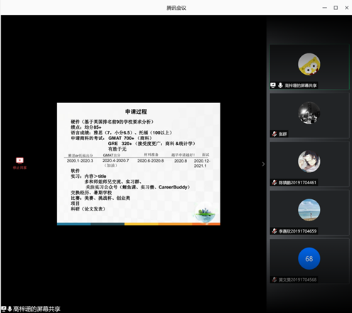 高梓珊同学主要通过比较境内外读研的异同,结合各位同学们升学的目的、自身的经济条件、安全问题等,帮助同学们分析申请境外读研的可行性和必要性。她还结合自身的经验分享了申请境外留学的时间线和所需材料,提醒同学们在申请时需要认真遵循学校官网的申请流程。她鼓励同学们要提升自身综合实力,为申请境外留学做好前期准备。在互动答疑环节,她结合自身的经验及经历给提问的同学提供了许多切实可行的建议。