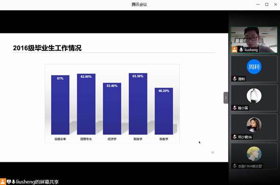 刘胜老师首先分析了受疫情影响后的我国宏观经济变动现状,由此指出了当前经济形势的严峻性,尤其是未来几年的就业市场。其次,刘老师分享了其所在经贸学院的毕业生就业和考研情况,并指出当前就业与考研的竞争形势不容乐观。最后,刘老师结合自身经验就考研、就业以及平时的课业学习等方面依次给出了相应的详尽建议。会议中,同学们积极向刘老师提问,并就自身感兴趣的问题认真向刘老师请教。