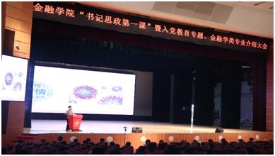 2020年9月25日下午,金融学院新生开学思政第一课暨专业介绍大会于南校区大会堂举行,并在Bilibili平台同步直播。金融学院党委书记徐昶斌,各系主任,学工办辅导员以及我院全体2020级新生出席大会。大会由辅导员梁倩蓉主持。